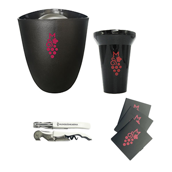 Innehåller en kylhink, två 3-pack droppstopp, två vinöppnare och en spottkopp.