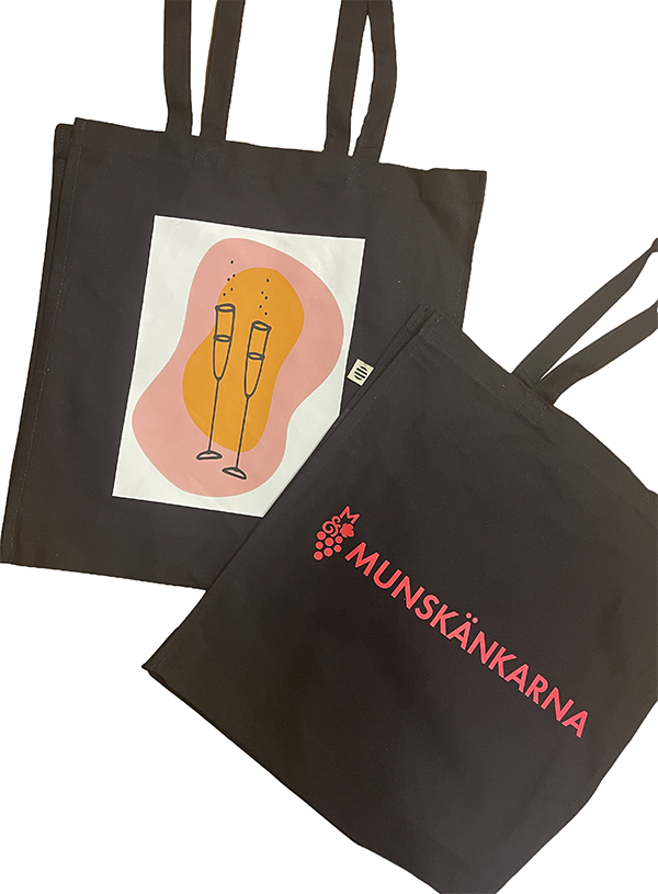 Svart tygväska med Munskänksloggan på ena sidan och två champagneglas på den andra...